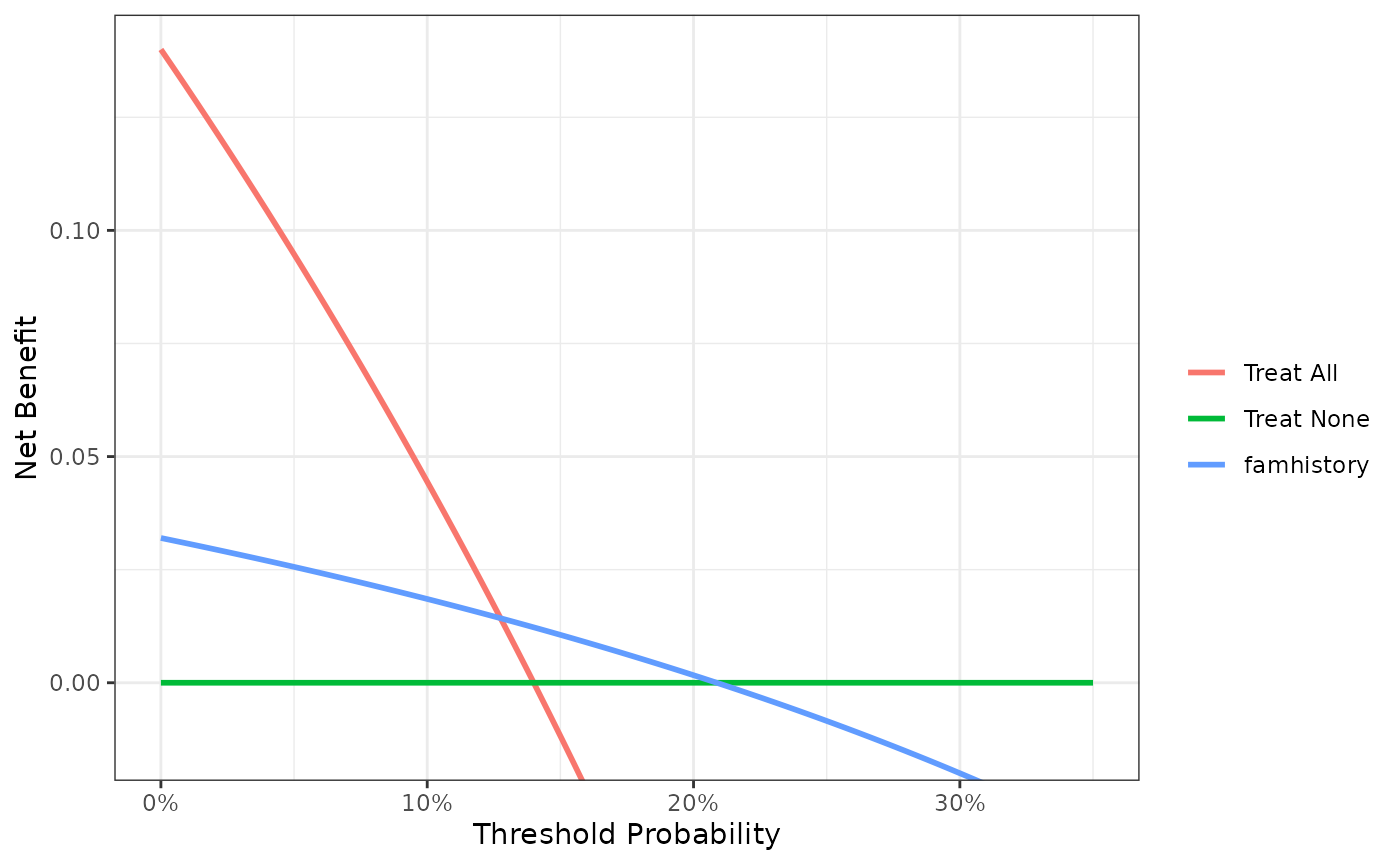 #> 6 0.35 -0.323 0 0.0116 -0.0159 0.00861Net benefit has a ready clinical interpretation. The value of 0.03 at a threshold probability of 20% can be interpreted as: “Comparing to conducting no biopsies, biopsying on the basis of the marker is the equivalent of a strategy that found 3 cancers per hundred patients without conducting any unnecessary biopsies.”